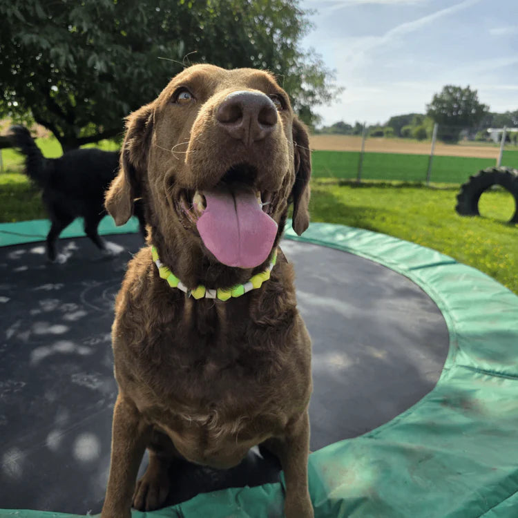 Diese handgefertigte Kette ist ein echter Hingucker – tagsüber durch die schlichten, schönen Silikonperlen in sanften Farben, die sich wunderbar zum Halsband oder Geschirr kombinieren lassen. Sie wirkt hochwertig und liegt angenehm am Hundehals, ganz ohne zu stören.